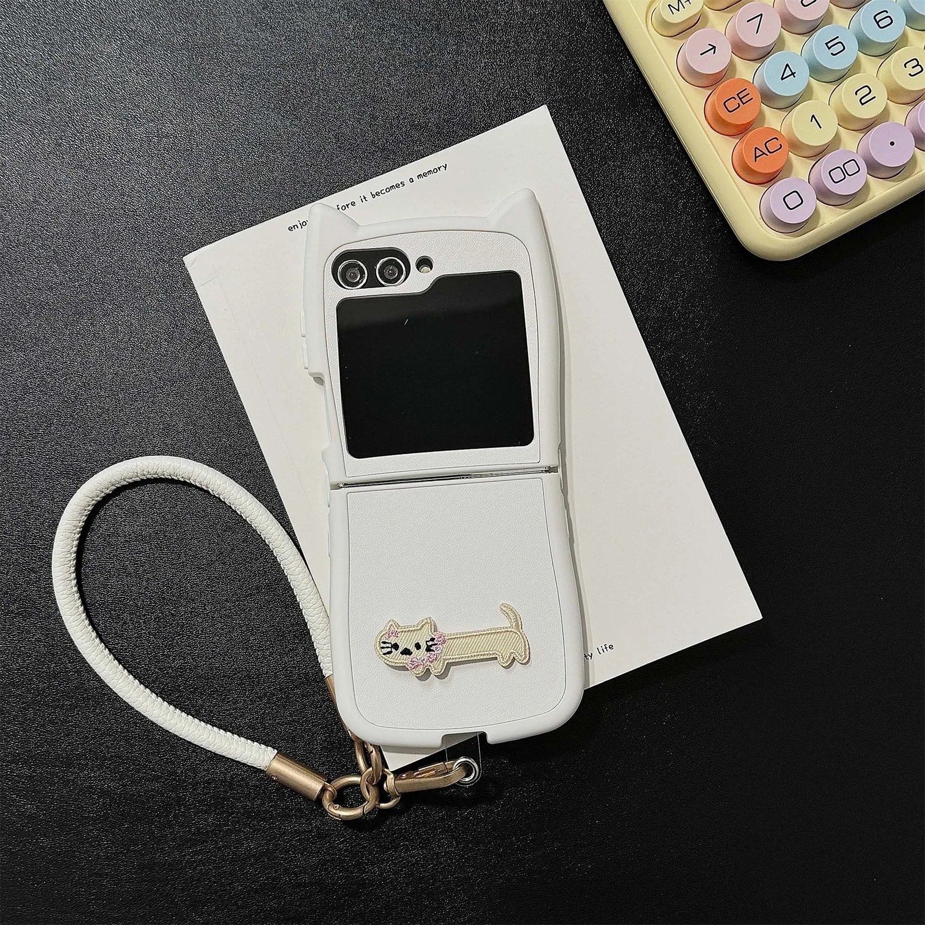 About Dopamine Color Embroidery Cat Ear Phone Case with Hand Strap for Galaxy Z Flip 4/5/6: